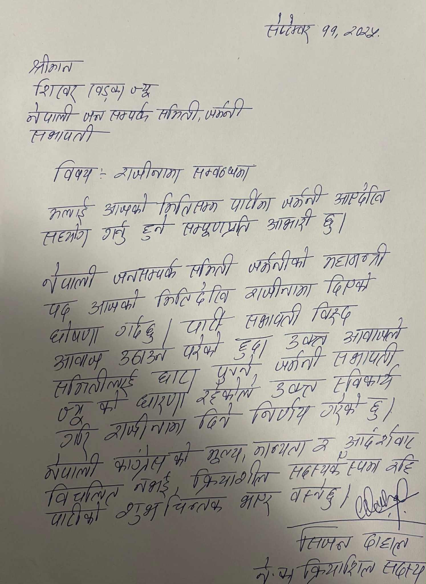 दाहालले असहमति जनाउदैँ सेप्टेम्बर ११ मै सभापति शिखर खड्कालाई राजीनामा पत्र बुझाएको खवर प्राप्त भएको छ । गुपचुप राखिएको उक्त पत्रमा उनले सभापतिको पछिल्लो गतिविधिसँग असहमति जनाउँदै महामन्त्री परित्याग गरेको उल्लेख छ । समितिहरू बीचको विवाद समाधानमा नेपाली कांग्रेस नेतृत्वले चासो नदेखाउँदा हाल एक दर्जनभन्दा बढी मुलुकका जनसम्पर्क समितिमा विवाद चर्किएको बताइन्छ ।