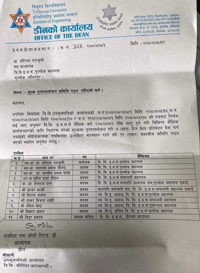 काठमाडौं - इन्जिनियरिङ अध्ययन संस्थान (आईओई)ले शुल्क पुनरावलोकन गर्न विद्यार्थी प्रतिनिधि सहितको नयाँ समिति गठन गरेको छ । आईओईले पुल्चोक क्याम्पसका सहप्राध्यापक डा. हरिराम पराजुलीको संयोजकत्वमा ११ सदस्यीय समिति गठन गरेको हो ।